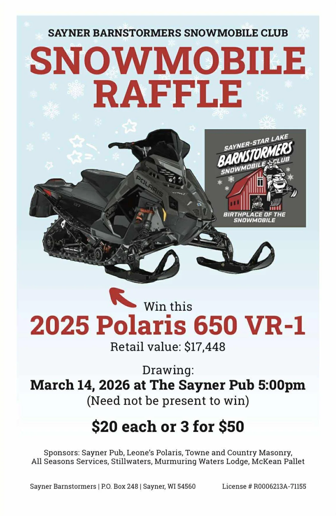 The Barnstormers Snowmobile Club welcomes you to Sayner-Star Lake, Wisconsin - the “Birthplace of the Snowmobile”! We proudly groom nearly 80 miles of snowmobile trails in Vilas County, Wisconsin, and maintain some of the oldest and most pristine trails in the state. Please come join us!